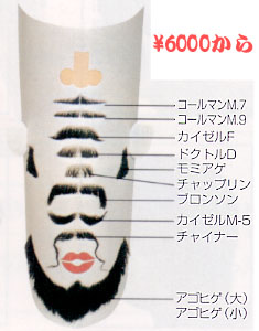 | 世の中には「もっと早く知ってればよかった」とか「一度体験してみて人生が変わった」 という出来事があるものです。人生においては、就職や結婚、普段の変化のない 生活などもそいう出来事でしょう。 その中でもかつらをつけることは実は極めて重大なものです。 使ってみて人生が変わった、性格が明るくなった、積極的な性格に変わったなど これはヘアースタイルにいえることですが、第一印象はよく「顔」「目」とかも言われています。 でもわれわれ理容師は顔剃り、フェイシャルマッサージぐらいしかから なかなか脱皮できません。メイクも整形もできませんし、でも イメージの変化はチョットだけ自然にあなたに満足感をプラスしてみませんか つけヒゲは、個性を主張するライフスタイルにぴったり。 TPOに合わせ、ファッショナブルなアクセサリーとしてご使用できます。 |