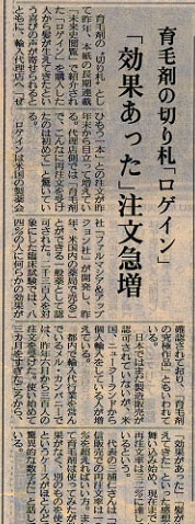 | 人類のほぼ半数をうわまわる成年男子は、多かれ少なかれある程度の 髪の損失を免れ得ません。 そして、すべての人がというわけではありませんが、 大半の人々がそれによって大きくイメージを変えられてしまうことを 余儀なくされているのです。髪が薄くなることに対して様々な 処置が試みられてきました。中には諦めてしまう人もいますが、 大半の人はなんとか隠そうと奮闘してきました。 ところが、今やっとそういった人々に朗報が届きました。 ミノキシジルは、抜け毛を完全に押しとどめるだけでなく、 絶対に生える事が無いとされてきた頭髪をもう一度 復元させる事ができるのです。 ミノキシジルはもともと、心臓病の降圧剤として開発されてきました。 体内に取り入れられることにより、ミノキシジルは血管拡張または 血行促進を起こすことによって、緊張をほぐす作用があります。 初期の実験報告の中に、興味深い副作用についての記述がみられました。 患者の多くに、以前はわずかか全く毛のなかった部分に発毛が みられたというものです。 この発見によって医者たちは、 ただちにミノキシジルを局部的あるいは影響のあった部分に 使用する実験を始め、ミノキシジルが髪の成長を促すという 確かな結果を得たのです。 何十年にもわたる研究の末、ミノキシジルは安全かつ効果的であるとされ、 アメリカでアップジョン社によって発毛促進剤とし販売されるに至りました。 現在、アメリカをはじめ世界中の国でFDAの承認を得て、 ミノキシジルを用いた発毛促進剤は販売されています。 現在、世界中の何十万という人がミノキシジルを使用し 、それによって髪をとりもどし、精神的にも大きな自信へと つながっているのです。 日本では某製薬会社がが厚生省に 数年前より認可申請していたミノキシジル溶液を使用した育毛剤が ようやく今年(1999年)承認され、今年6月に発売開始され 発売開始と同時に売れ切れ店が続出するなどテレビ、新聞等で 話題となりましたが、有効成分のミノキシジル溶液の濃度は1%で、 効果が現れ始めるまでに最低でも6ヶ月は必要と言われています 強力型のミノキシジル5%の育毛剤は今後も個人輸入という 形式でしか入手出来ない状況が続く見通しです。 | ||