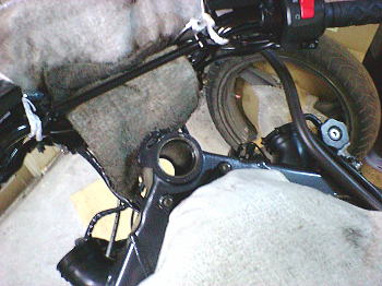 キャリパーは軍手を被せリリースタイで車体から吊下げ。