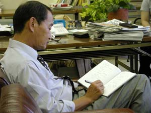| いよいよ、記者会見。 担当記者の山口さんは、資料を見ながら丹念に話を聞いてくれました。 |