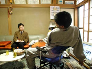 3月1日午前中に行われた取材は、記者の質問に理事長が答える形で約30分にわたって行われました。終始メモをとりながらフムフムと頷きながらも次の質問が!理事長も、少しでもこの講演録を広めたいと一生懸命に伝えていました。 |
